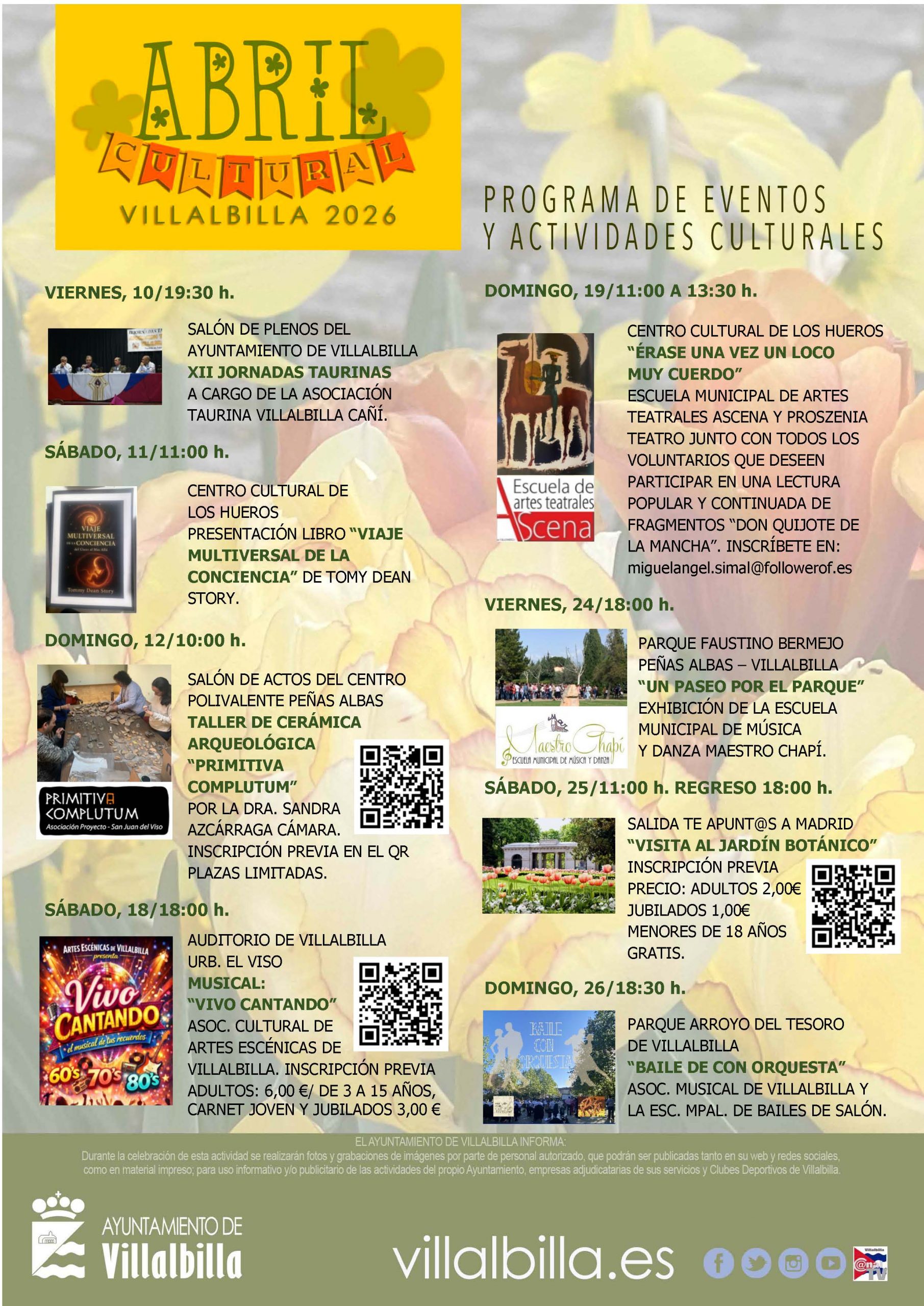 El mes de abril llega a Villalbilla cargado de propuestas que invitan a los vecinos a participar activamente en la vida cultural del municipio. Para ello, contamos con una programación variada que abarca desde las tradicionales actividades que están presentes cada año hasta talleres de arqueología, pasando por espectáculos musicales de gran formato y salidas culturales fuera del municipio.