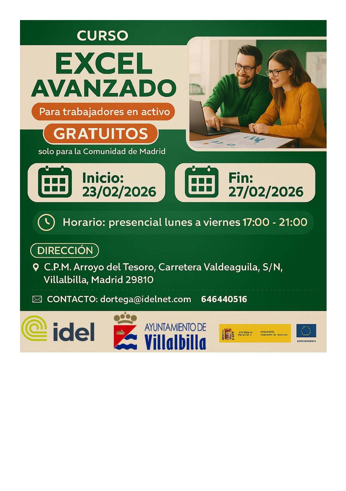 El Ayuntamiento, a través de la Concejalía de Desarrollo Económico, pone en marcha un curso gratuito de Excel Avanzado dirigido a trabajadores y trabajadoras en activo, con el objetivo de mejorar sus competencias digitales y favorecer su desarrollo profesional.
