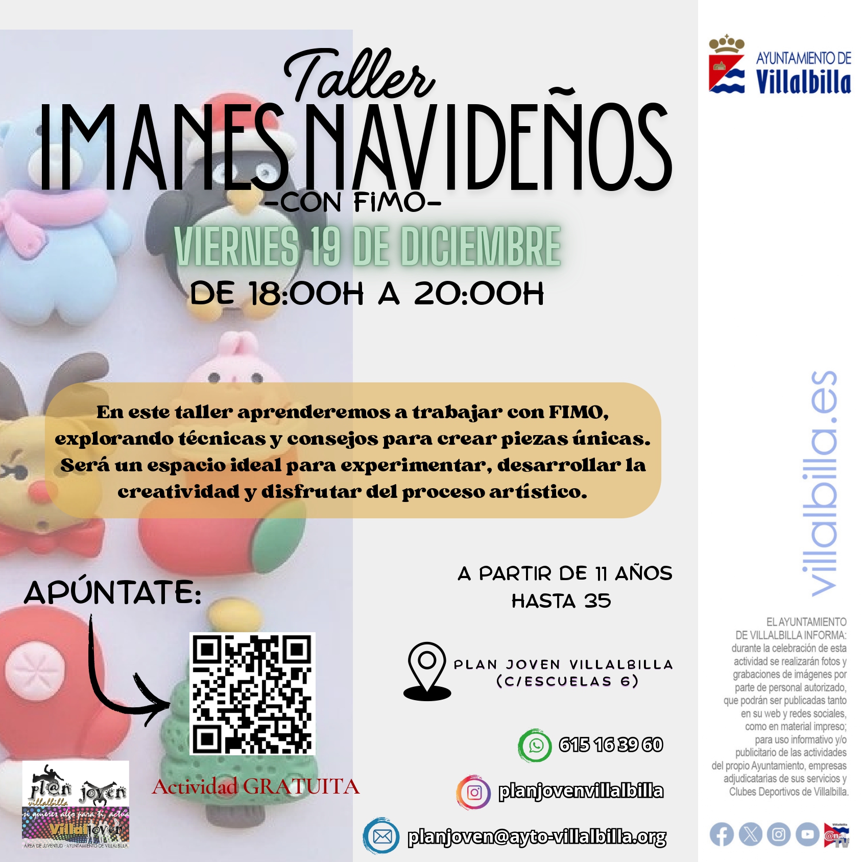 Crear, experimentar y llevarse a casa una pieza única hecha a mano. Ese es el objetivo del taller de imanes navideños con FIMO que el Plan Joven ha preparado para estas fechas, una actividad gratuita dirigida a jóvenes de entre 11 y 35 años que combina ocio, creatividad y espíritu navideño.