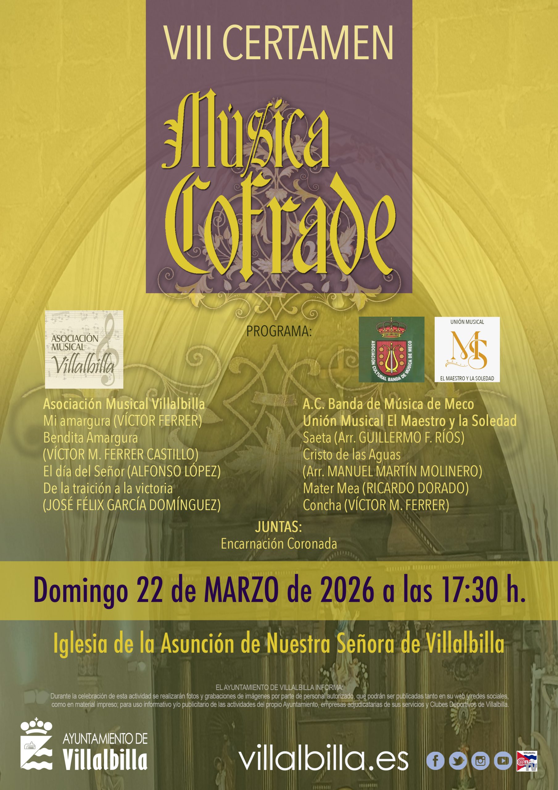 En esta edición participarán la Asociación Musical Villalbilla, la A.C. Banda de Música de Meco y la Unión Musical El Maestro y la Soledad, que interpretarán diferentes marchas procesionales y piezas emblemáticas del repertorio cofrade.