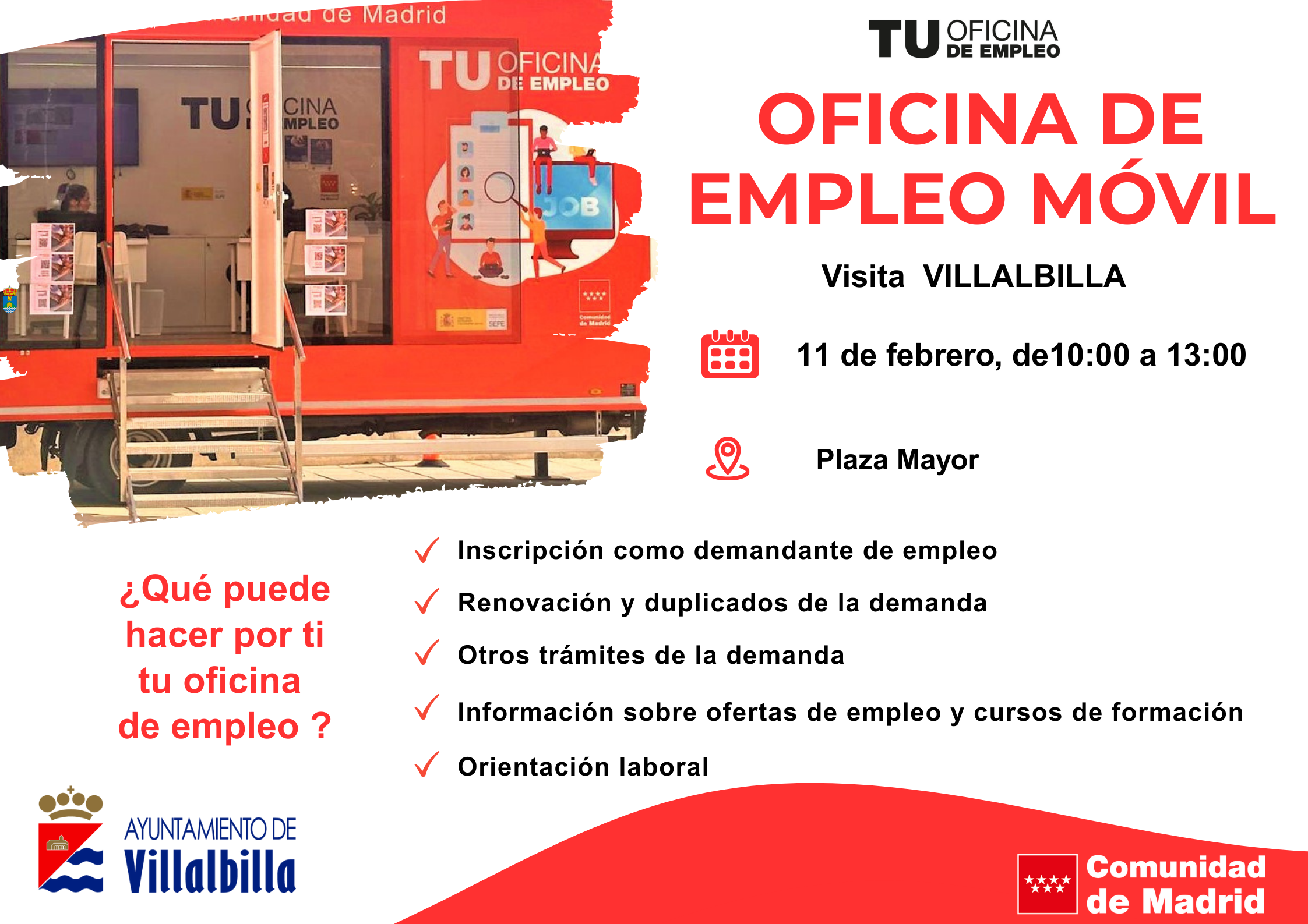 El próximo 11 de febrero, la Oficina de Empleo Móvil visitará Villalbilla para que puedas realizar distintos trámites relacionados con el empleo sin necesidad de desplazarte a otras localidades.
