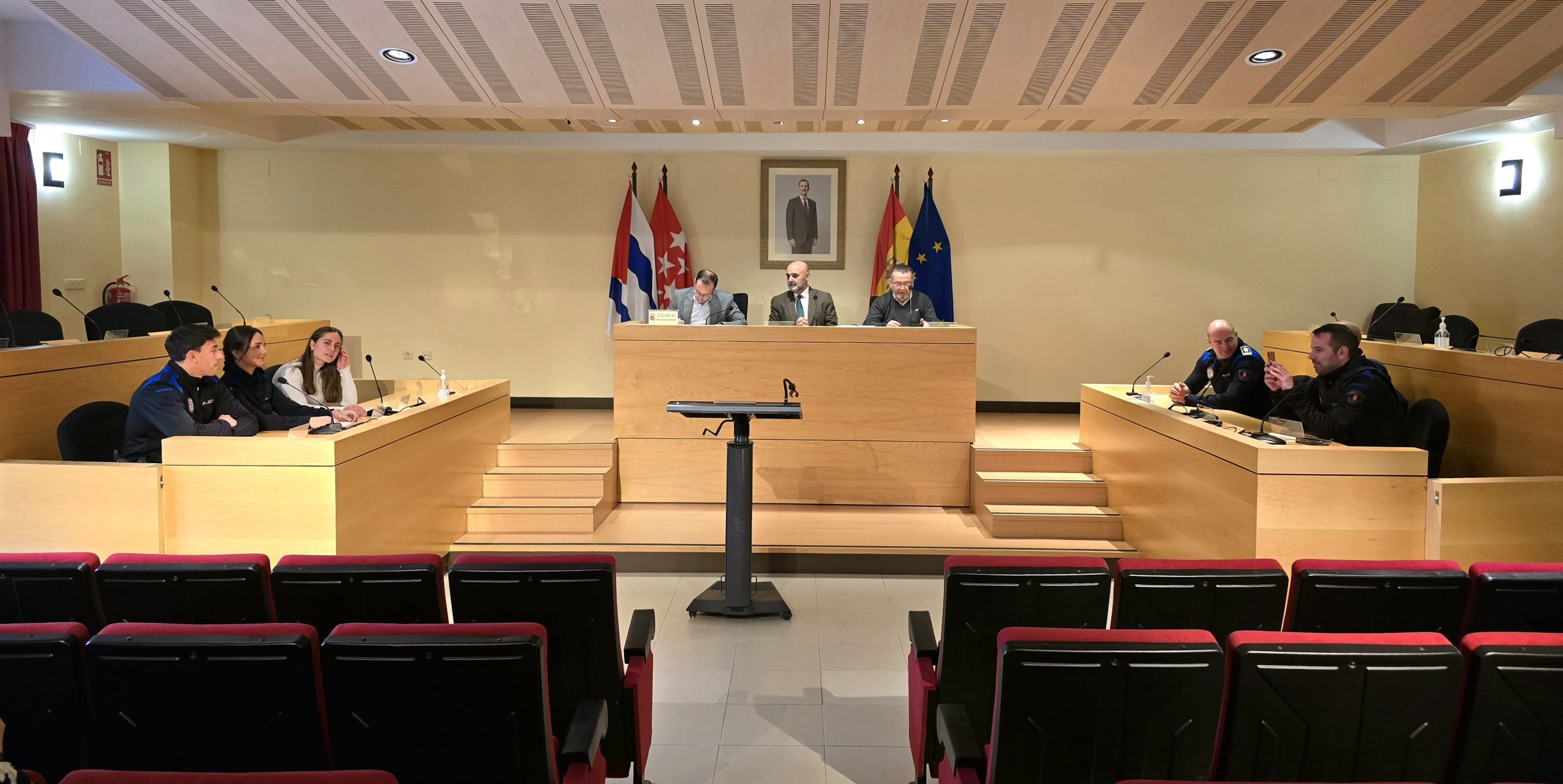 Mañana de compromiso y vocación de servicio en el Ayuntamiento de Villalbilla. En un acto solemne celebrado hoy en el Salón de Plenos, los cuatro agentes que iniciaban sus prácticas