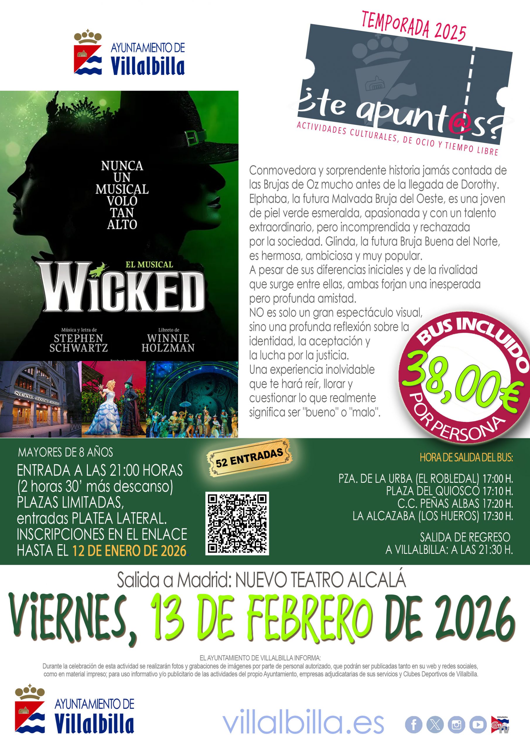 La cita a Madrid para asistir a WICKED, El Musical, será el viernes 13 de febrero de 2026, con destino al Nuevo Teatro Alcalá.