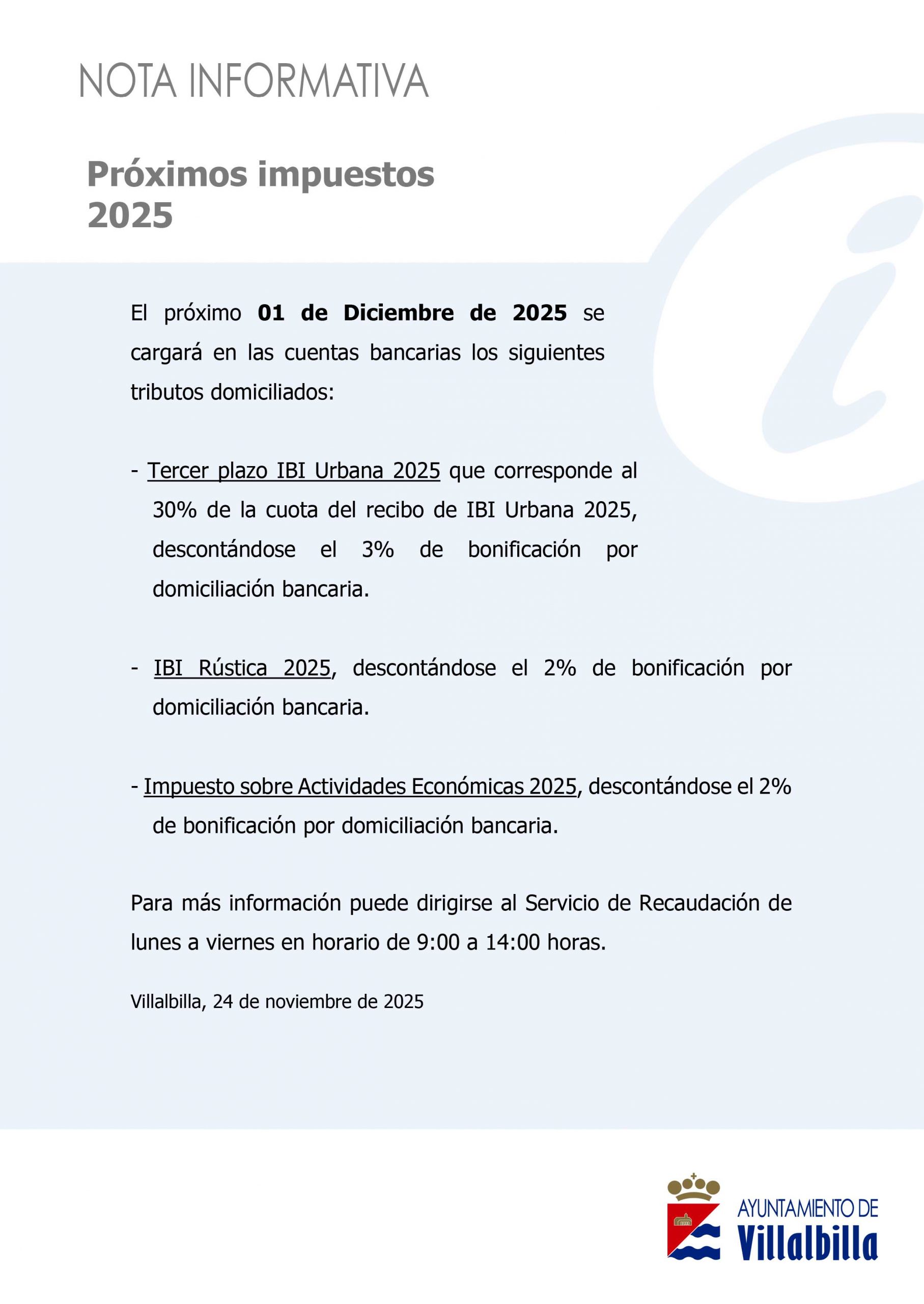 El próximo 1 de diciembre se procederá al cargo en cuenta bancaria de los tributos municipales que se encuentren domiciliados. Los impuestos que se cargarán son los siguientes: