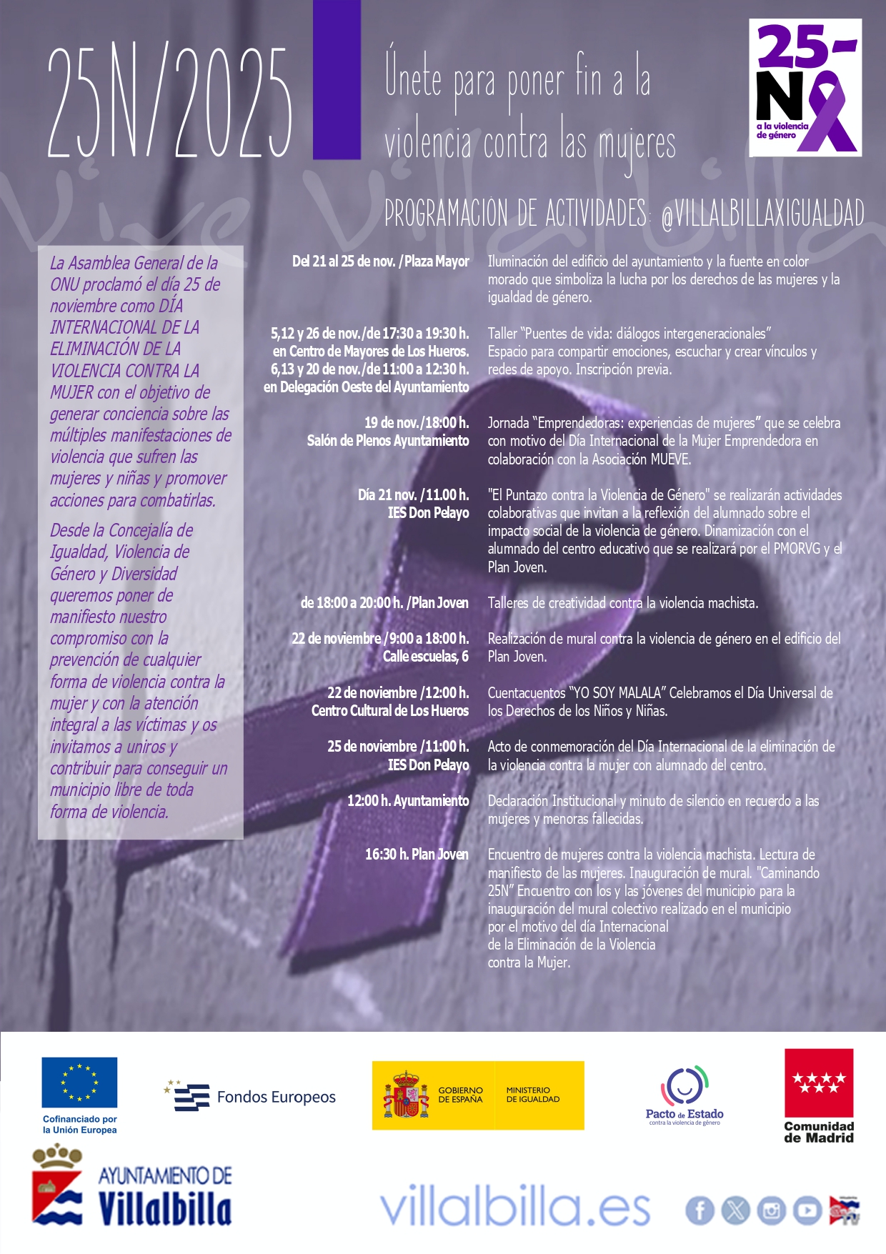A lo largo del mes se llevarán a cabo actividades de sensibilización, formación, reflexión colectiva y participación, tanto en espacios educativos como culturales y juveniles, con el propósito de promover la igualdad, visibilizar las distintas formas de violencia que sufren mujeres y niñas y reforzar el compromiso municipal con la prevención y la atención integral a las víctimas. Estas propuestas buscan fomentar la implicación social y avanzar hacia un municipio libre de cualquier forma de violencia contra la mujer.