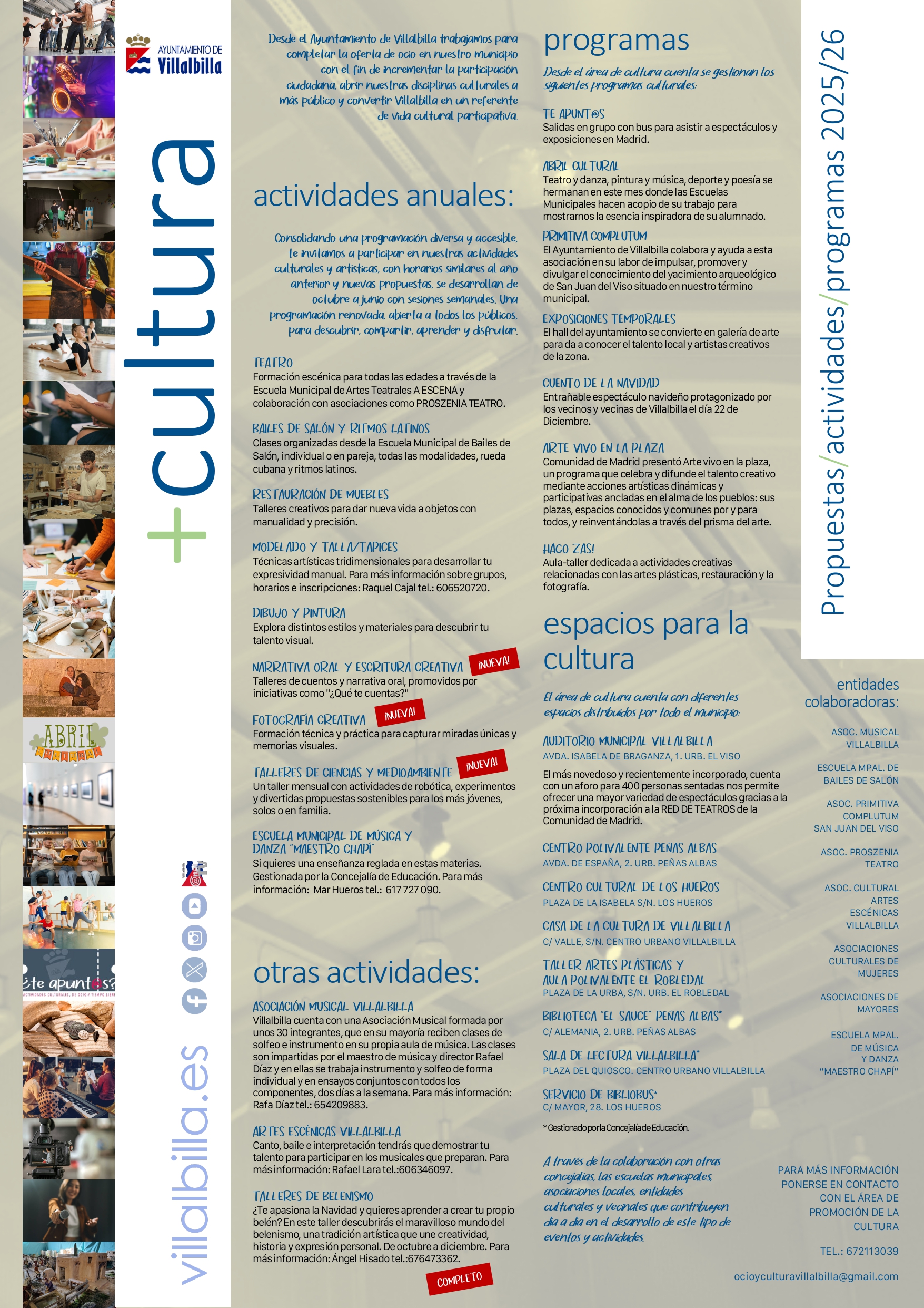 El Ayuntamiento de Villalbilla ha presentado su nueva programación cultural para el curso 2025/26, una completa oferta de talleres, espectáculos y actividades abiertas a todos los públicos. El objetivo: convertir el municipio en un referente de vida cultural participativa, fomentando la creatividad, el aprendizaje y la convivencia vecinal.